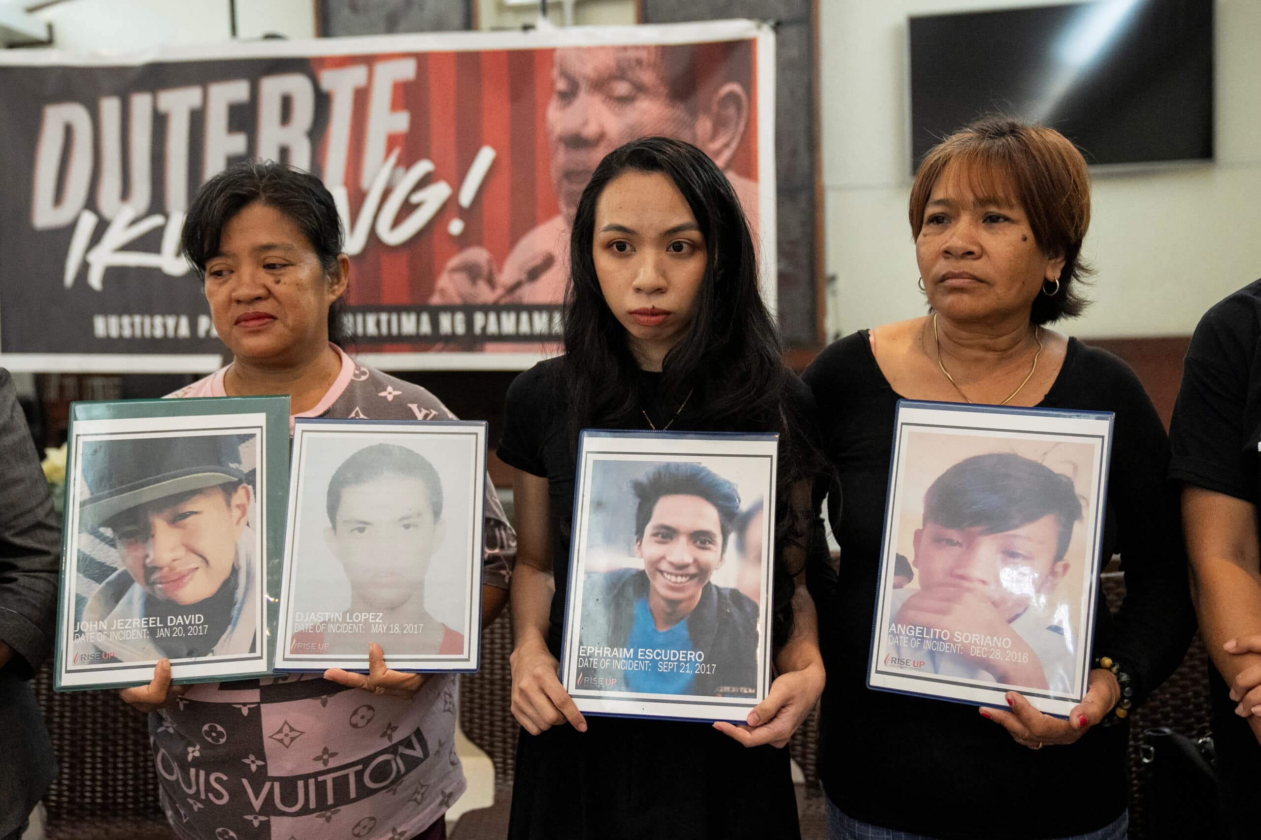 Relatives hold pictures of drug war and extrajudicial killing victims during a press conference following the arrest of former President Rodrigo Duterte, in Quezon City, Metro Manila, Philippines, March 12, 2025. REUTERS