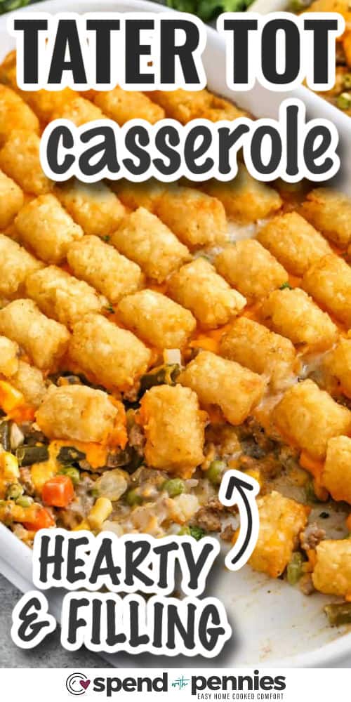 Tater tot casserole is a cozy dish made with seasoned beef, veggies, creamy sauce, melty cheese, and a golden tater tot topping.